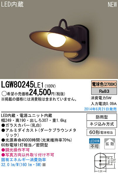 LGW80245LE1 パナソニック LEDポーチライト(5.2W、拡散タイプ、電球色)