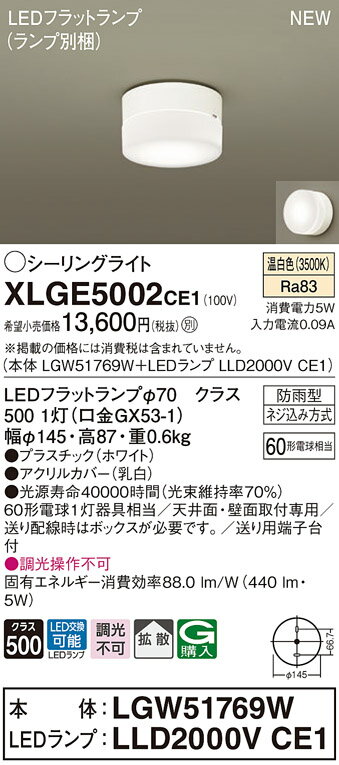 XLGE5002CE1 パナソニック 軒下用LEDシーリングライト 拡散 温白色
