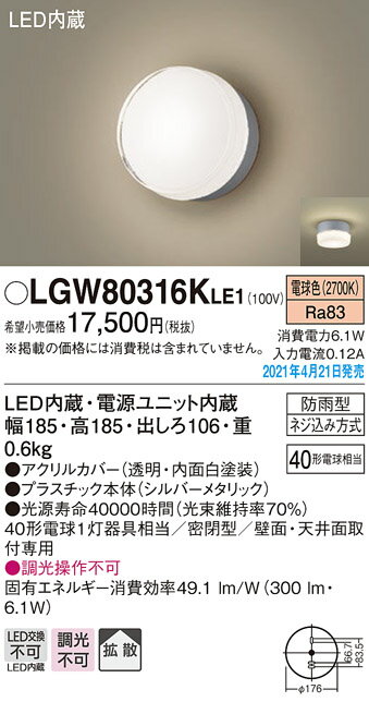 LGW80316KLE1 パナソニック LEDポーチライト 拡散 電球色