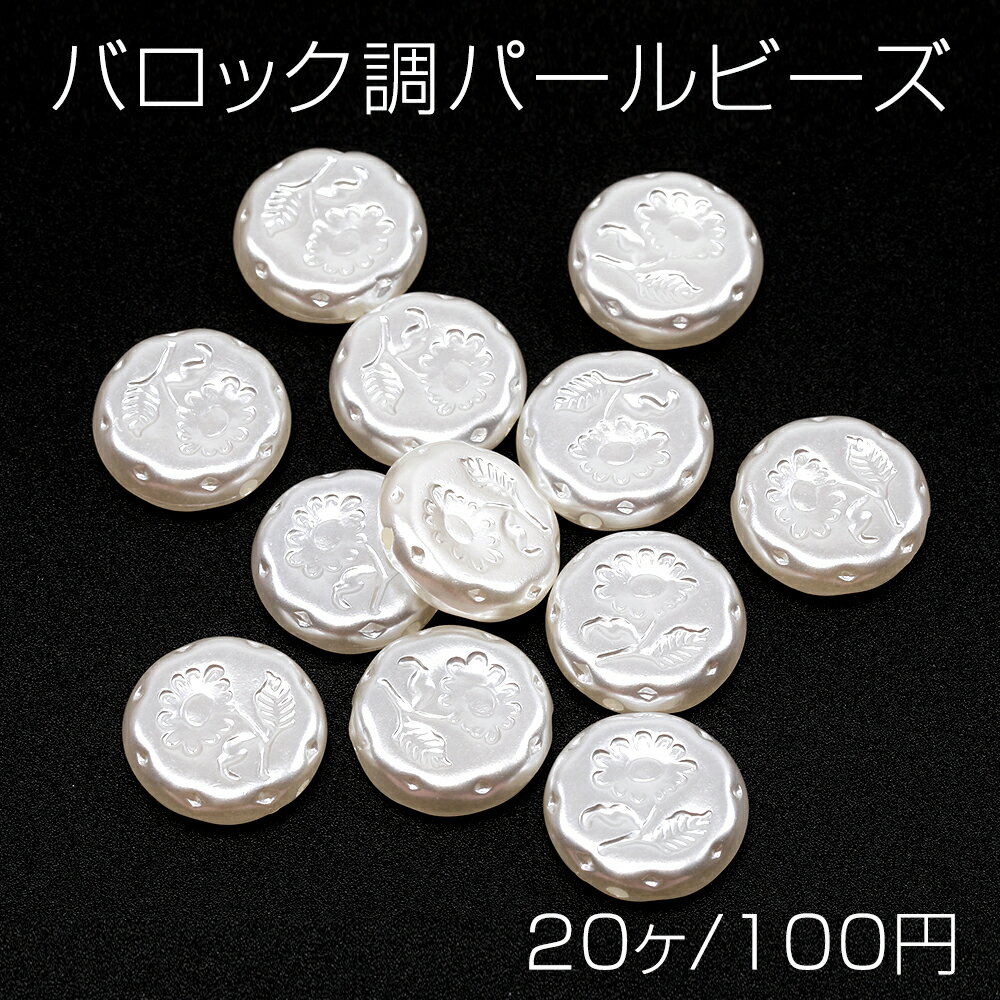 バロック調パールビーズ アクリル製 コイン型 フラワー模様入り 通し穴あり 約18mm(20ヶ)