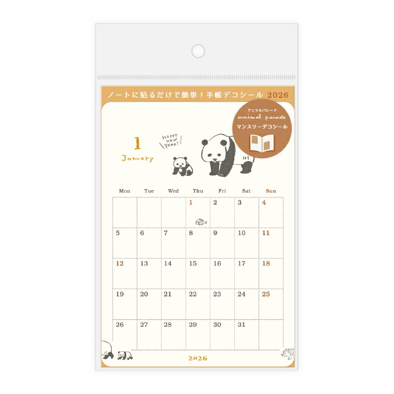 2026年度 マンスリーデコシール 月曜始まり アニマルパレード かわいい おしゃれ 女子文具 手帳 スケジュール帳