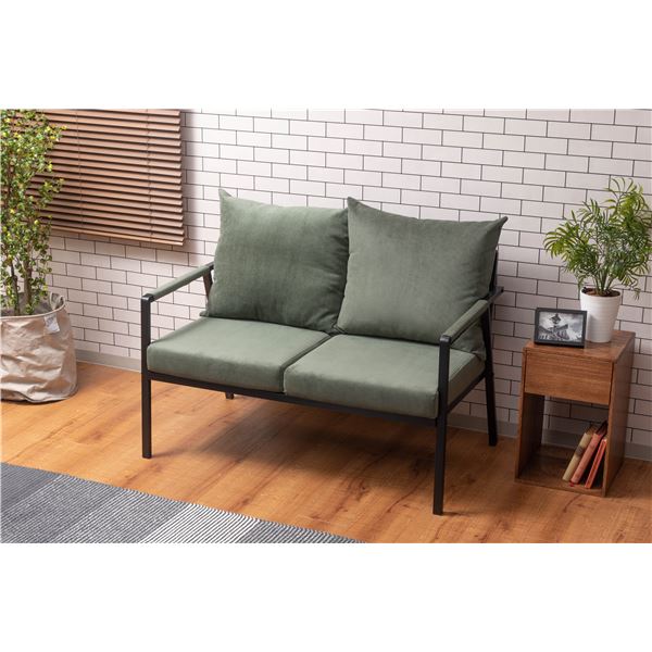 日本製 リクライニングソファー / ローソファー 【2人掛け タスク生地 グリーン】 脚部:ブラウン 幅131cm 肘付き 脚付き