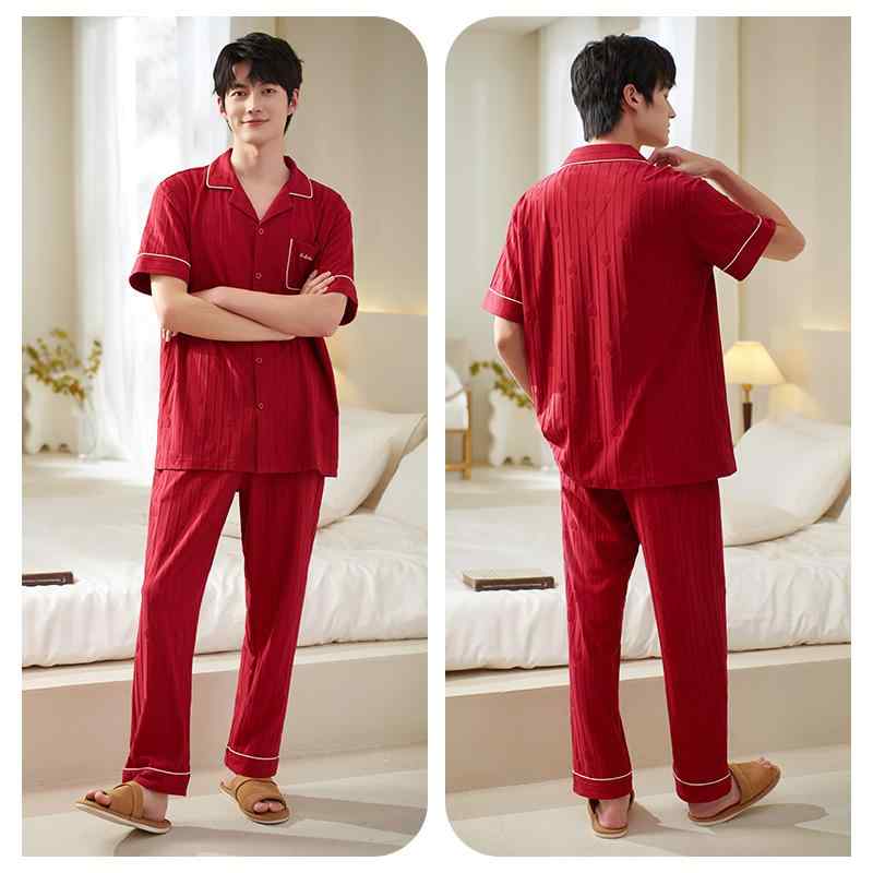 パジャマ メンズ おしゃれ 快適 半袖 長袖 長ズボン レッド 春夏 綿 部屋着 ルームウェア