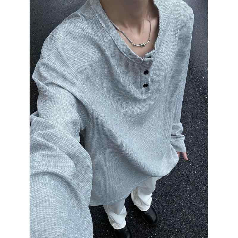 Tシャツ メンズ ストリート ゆるT 春秋 アメリカ 長袖 ヘンリーネック トップス インナー リネン 麻 グレー 黒 白