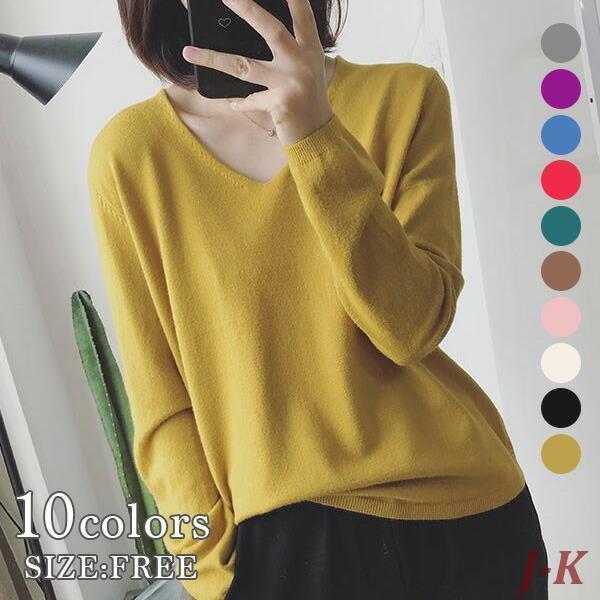Vネック シンプル ニット ニットソー 定番 カジュアル きれいめ 長袖 ヘビロテ 秋冬 トップス レディース