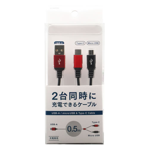 オズマ UC-MC05RD レッド 2台同時充電可能 二股ケーブル Type-C-micro 0.5m