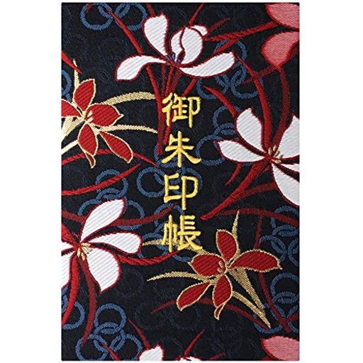 千糸繍院御朱印帳L【黒紅花金輪】西陣織金襴装丁/刺繍文字蛇腹式48ページ大判(金色刺繍文字/生成り本文)