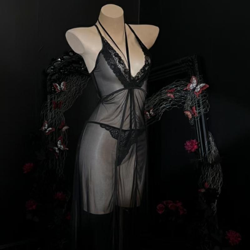 ナイトドレス レディース セクシー ルームウェア メドゥーサ シアー メッシュ キャミソール ロング丈 大きいサイズ ナイロン ブラック