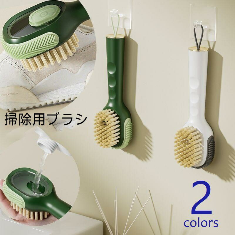 シューズブラシ 洗剤ディスペンサー付 靴洗いブラシ シューズクリーナー 柄付き 吊り下げ可 洗濯ブラシ 掃除用ブラシ ホワイト グリーン