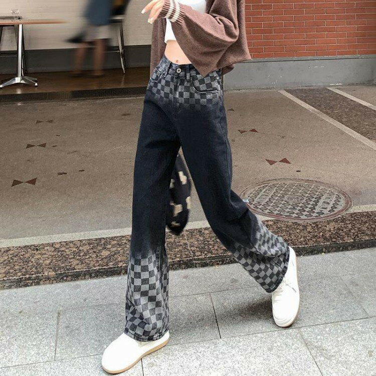 秋 ロング丈 市松模様 チェック柄 ブラックグレー ジーンズ ワイドレッグ デニム 黒 パンツ 灰色 春 ハイウエスト 大きいサイズ