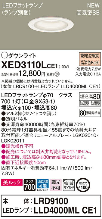 XED3110LCE1 パナソニック 軒下用LEDダウンライト 高気密SB形 φ100 拡散 美ルック 電球色