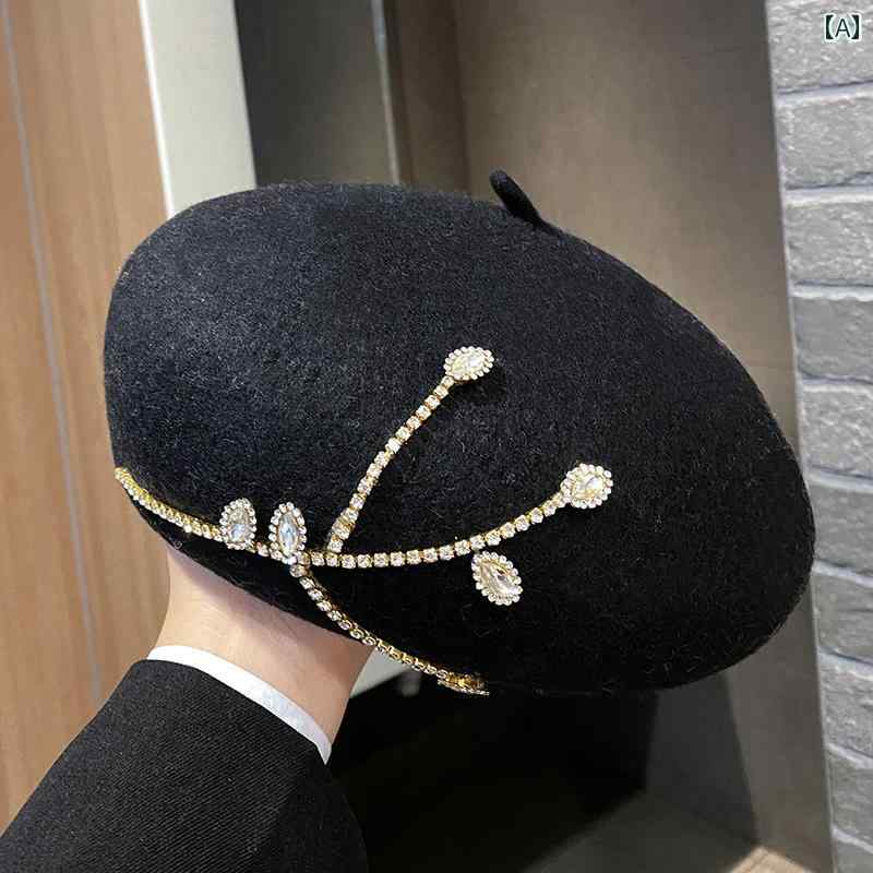 ベレー帽 レディース 帽子 キラキラ エレガント おしゃれ ウール ハット 秋冬 厚手 暖かい ラインストーン 黒 カーキ ベージュ