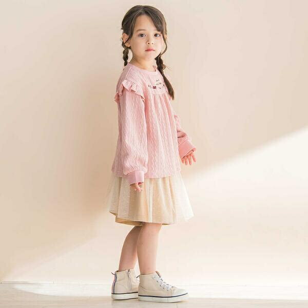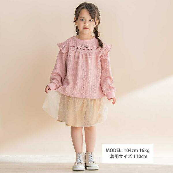 [型番:1770-77021]-25AW-透け感のあるラメ入りチュールが重なった女の子用キュロット。■デザインウエストからギャザーがいっぱい入ったラメ入りチュールが華やかな印象を与えます。パンツの切り替えにもギャザーが入ってガーリーなアイテムです。ベージュとグレーの2色展開でコーデしやすくなっています。■素材/機能肌触りのいい天竺生地を使用して着心地も◎表起毛になってふわふわと柔らかく暖かみのあるアイテムです。伸縮性のあるスパンフライスの襟は着用しやすくなっています。ラメ入りチュールは透け感とハリ感のある生地になっています。総ゴム仕様で穿きやすく調整しやすいのは嬉しいポイントです。▼おすすめコーデ1767-77072:トレーナー1773-77013:ベスト25秋冬アイテム【Noeil aime BeBe(ノイユ エーム べべ)】「Daily+」 デイリープラスLife・Relax・Basicをベースにトレンドをプラスしたリラックスカジュアルブランド。自分たちの趣味や流行を大事にしながらも、子供との時間を大切にしたいパパ・ママに向け子供服を提案します。■カラー:ベージュ、グレー80cm:ウエスト20 スカート丈23.5 パンツ丈22 裾幅2990cm:21 スカート丈25.5 パンツ丈24 裾幅30100cm:22 スカート丈28.5 パンツ丈27 裾幅31110cm:23 スカート丈32 パンツ丈30.5 裾幅32120cm:24 スカート丈35 パンツ丈33.5 裾幅34130cm:25.5 スカート丈38 パンツ丈36 裾幅36.5※( )で表記されている数字はヌードサイズです。ヌードサイズとは衣服を身につけない身体のサイズです。お客様ご自身の身体サイズと比較してお選びください。 ■素材: ベージュ/グレー:【本体】綿100% 【チュール部分】ポリエステル100% 【リブ】綿95% ポリウレタン5% ■お手入: 洗濯機 >>商品のお取り扱い方法 ■原産国: 中国ラメ入りチュールティアードキュロット(80~130cm)/ノイユ エーム ベベ(Noeil aim BeBe)ベージュグレー画面上と実物では、多少色具合が異なって見える場合がございます。