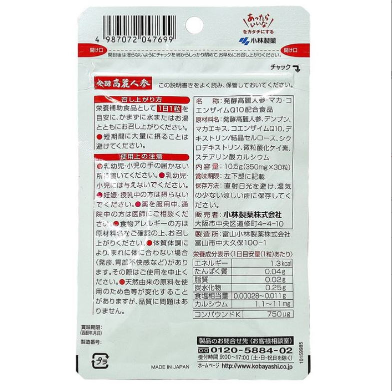 「小林製薬 発酵高麗人参 30粒 3個セット」は、小林製薬が提供する栄養補助食品で、発酵技術を用いて高麗人参の力を引き出しています。高麗人参は、健康維持をサポートする成分として知られており、日々の健康管理に役立ちます。毎日の生活に取り入れることで、健康的なライフスタイルをサポートします。小林製薬 発酵技術で生まれた発酵高麗人参 <発酵高麗人参の特長> ○発酵技術で素材の力を高めました。 ○着色料、香料、保存料すべて無添加 <1日目安量(1粒)あたり> エネルギー 1.3kcal たんぱく質 0.04g 脂質 0.02g 炭水化物 0.25g 食塩相当量 0.00028-0.011g カルシウム 1.1-11mg コンパウンドK 750μg <発酵高麗人参の原材料名> 発酵高麗人参、デンプン、マカエキス、コエンザイムQ10、デキストリン/結晶セルロース、シクロデキストリン、微粒酸化ケイ素、ステアリン酸カルシウム <発酵高麗人参のお召し上がり方 > 栄養補助食品として1日1粒を目安に、かまずに水またはお湯とともにお召し上がりください。 ※短期間に大量に摂ることは避けてください。 商品名:発酵高麗人参 内容量:350mg×30粒 保存方法:直射日光を避け、湿気の少ない涼しい所に保存してください。 賞味期限:パッケージに記載 広告文責:有限会社 横川ヤマト TEL:082-295-1732 販売元:小林製薬 お客様相談室:0120-5884-02 製造国・区分:日本・サプリメント JANコード:4987072047699 <注意事項> ・小さなお子さまの手の届かないところに置いてください。 ・薬を服用あるいは通院中の方、妊娠及び授乳中の方はお医者様にご相談の上お召し上がりください。 ・全成分表示をご参照の上、食品アレルギーのある方はお召し上がりにならないでください。 ・体質や体調により、まれにかゆみ、発疹、胃部不快感、下痢、便秘などの症状が出る場合があります。その場合は直ちにご使用をおやめください。 ・食品ですので衛生的な取り扱いをお願いします。 ・天然由来の原料を使用しておりますので、まれに色が変化する場合がありますが、品質に異常はありません。 ・直射日光をさけ、湿度の少ない涼しいところに保存してください。 予告無くパッケージが変更になる場合がありますので予めご了承ください。 製造・取扱い中止の場合はキャンセル処理をさせて頂く場合がございます。 仕入れ先の状況により納期期限より遅れる場合、欠品する場合がありますので予めご了承ください。 お客様のご都合によるご注文内容の変更・キャンセル・返品・交換はお受けできません。 開封後の返品、交換は一切お受けできません。
