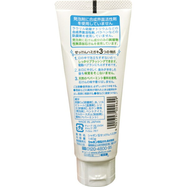 シャボン玉 せっけんハミガキ は、無添加の石けんをベースとしており、お口に優しく、使用後に味覚を損なわない歯みがき粉です。 合成界面活性剤使用のハミガキのように過剰に泡立つ事がなく、程よい泡立ちでブラッシングの邪魔をしません。 天然のペパーミントを使用しているのでマイルドなミント味で、強いミントが苦手なお子様にもお使いいただけます。 ・発泡剤にラウリル硫酸ナトリウムなどの合成界面活性剤ではなく、無添加石けんを使用。着色料、防腐剤は不使用 ・辛くなく、泡立ちすぎないので、しっかりとブラッシングできる ・歯みがき後にも味覚が変わらない ・やさしいペパーミントの味と香りで、歯磨き後はスッキリ ・電動歯ブラシにも使用可能 <シャボン玉本舗> 私たちがこだわる無添加とは 最近、「無添加」をうたう化粧品や洗顔料が増えてきています。合成界面活性剤などが入っていても香料や着色料など、何か添加物が1種類入っていないだけで「無添加」とうたっているものも多く存在します。 はたしてそれは消費者が思っている「無添加」なのでしょうか? シャボン玉石けんの「無添加」とは、成分は石けん成分のみのものです。 そしてその石けん成分も、肌への優しさを考えケン化法というこだわりの製法で作っているのです。 あなたの「無添加」は本当に「無添加」ですか? 石けんや合成洗剤は添加物が1種類入っていないだけでも無添加といえます。※ シャボン玉の無添加石けんは「石けん成分(液体は水も含む)以外は何も入っていない」石けんです。 ※「蛍光剤、漂白剤、着色料無添加」は「蛍光剤、漂白剤、着色料(が)無添加」という意味です。 ■商品名:歯磨き粉 はみがき 子供 シャボン玉 せっけんハミガキ 無添加 天然 ペパーミント 炭酸カルシウム シリカ ベントナイト 送料無料 ■内容量:140g ■全成分表示:炭酸カルシウム(清掃剤)、シリカ(清掃剤)、精製水(基剤)、ソルビトール(湿潤剤)、セルロースガム(粘結剤)、ベントナイト(粘結剤)、石ケン素地(発泡剤)、香料(ペパーミント・香味剤) ■メーカー或いは販売者:シャボン玉本舗 ■区分:化粧品 ■製造国:日本【免責事項】 ※記載の賞味期限は製造日からの日数です。実際の期日についてはお問い合わせください。 ※自社サイトと在庫を共有しているためタイミングによっては欠品、お取り寄せ、キャンセルとなる場合がございます。 ※商品リニューアル等により、パッケージや商品内容がお届け商品と一部異なる場合がございます。 ※メール便はポスト投函です。代引きはご利用できません。厚み制限(3cm以下)があるため簡易包装となります。 外装ダメージについては免責とさせていただきます。