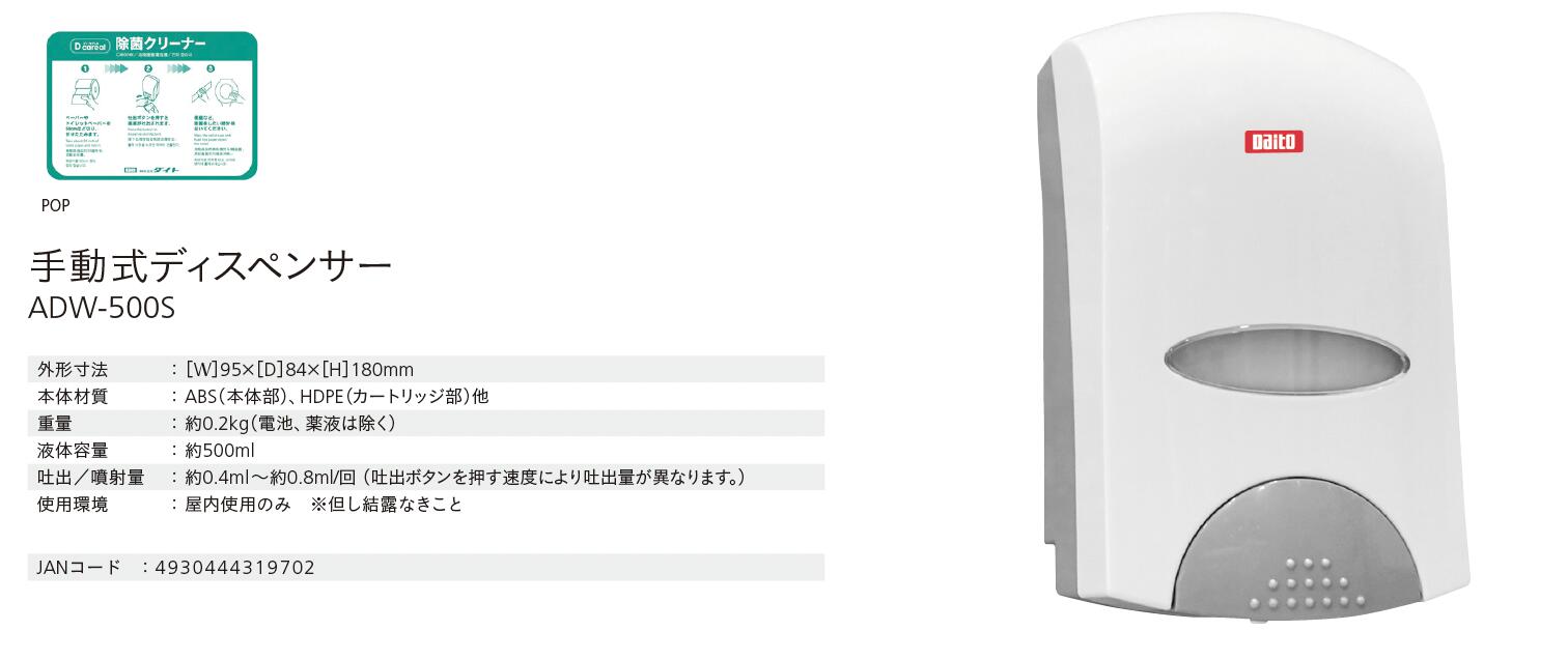 width="100%"> 手動式ディスペンサー ADW-500S×5セット 便座クリーナー ホテル、飲食店、など様々なシーンで活躍できます。 ●サイズ 横×縦×高:95×84×180mm ●本体材質 ●重量 約500ml ●噴射量 約0.4ml〜約0.8ml ●使用環境 屋内環境のみ