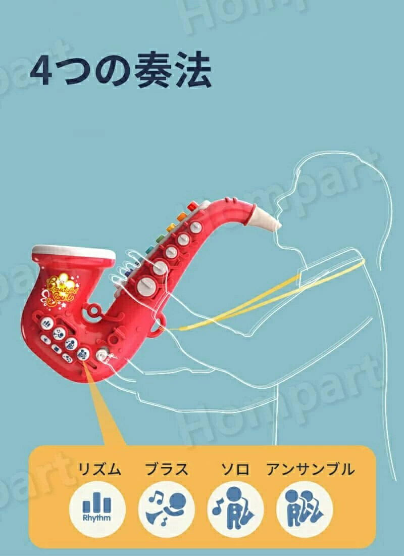 商品情報 商品名称:サックス 適齢期:3歳以上 サイズは26 × 23 × 8.5cm 給電:単3電池3本(電池附きなし) コンテンツ機能&カラー選択 8つの音階ボタン(息を合わせる必要がある) 6つのリズム/10つのブラス/10つのソロ/10つのアンサンブル スイッチ 5段ボリューム/ポーズ/10曲
