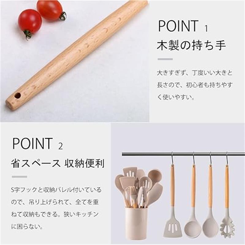 ?一感のある配色 キッチンツール12点セットフライ返し、おたま、トング、泡立て器、スパチュラとスプーンなど台所用品は軽くて丈夫な上にかわいい見た目、いつも綺麗に見えるキッチンを演出。和食ではなく、洋風料理、炒め物多いの中華料理、幅広く調理に活躍できるので、ぜひキッチンだけではなく、アウトドア、パーティーなどの料理用品としても最適です。高品質のシリコン素材 安全性を重視本製品は国際食品衛生基準(FDA)試験に合格していて、BPAフリー、有害物質なしのシリコン製を採用。鍋やフライパン、食器などを傷つけにくい柔らかさで、食材の色移りも汚れもさっと洗剤を含ませたスポンジで洗い出来るので楽チン。ナチュラル雰囲気 木の優しい温もり木製の持ち手は大きすぎず、丁度いい大きと長さので、初心者も持ちやすく使いやすい。帰りたくなるような心地良い台所用品に囲まれた空間を演出。柔らかなナチュラルキッチンにぴったりので、普段家事や仕事に疲れている主婦はもちろん、一人暮らし、新生活やお引越し祝いなどのプレゼントにもおすすめ。耐高低温&耐久性 収納便利耐熱温度は-40℃~230℃、熱湯消毒と塩素漂白も対応。S字フックと収納バレル付いているので、持ち手の穴で吊り上げられて、全てを重ねて収納もできる。狭いキッチンに困らない。ご注意:商品本体はシリコン匂いが少し付いてありますが、熱湯で洗えば、2,3日放置し、匂いが消えていきます。商品の品質につきましては万全を期しております。万が一お届けの商品が不具合などございますたら、弊店にメールにて連絡するようお願い致します。?一感のある配色 キッチンツール12点セットフライ返し、おたま、トング、泡立て器、スパチュラとスプーンなど台所用品は軽くて丈夫な上にかわいい見た目、いつも綺麗に見えるキッチンを演出。和食ではなく、洋風料理、炒め物多いの中華料理、幅広く調理に活躍できるので、ぜひキッチンだけではなく、アウトドア、パーティーなどの料理用品としても最適です。高品質のシリコン素材 安全性を重視本製品は国際食品衛生基準(FDA)試験に合格していて、BPAフリー、有害物質なしのシリコン製を採用。鍋やフライパン、食器などを傷つけにくい柔らかさで、食材の色移りも汚れもさっと洗剤を含ませたスポンジで洗い出来るので楽チン。ナチュラル雰囲気 木の優しい温もり木製の持ち手は大きすぎず、丁度いい大きと長さので、初心者も持ちやすく使いやすい。帰りたくなるような心地良い台所用品に囲まれた空間を演出。柔らかなナチュラルキッチンにぴったりので、普段家事や仕事に疲れている主婦はもちろん、一人暮らし、新生活やお引越し祝いなどのプレゼントにもおすすめ。耐高低温&耐久性 収納便利耐熱温度は-40℃~230℃、熱湯消毒と塩素漂白も対応。S字フックと収納バレル付いているので、持ち手の穴で吊り上げられて、全てを重ねて収納もできる。狭いキッチンに困らない。ご注意:商品本体はシリコン匂いが少し付いてありますが、熱湯で洗えば、2,3日放置し、匂いが消えていきます。商品の品質につきましては万全を期しております。万が一お届けの商品が不具合などございますたら、弊店にメールにて連絡するようお願い致します。
