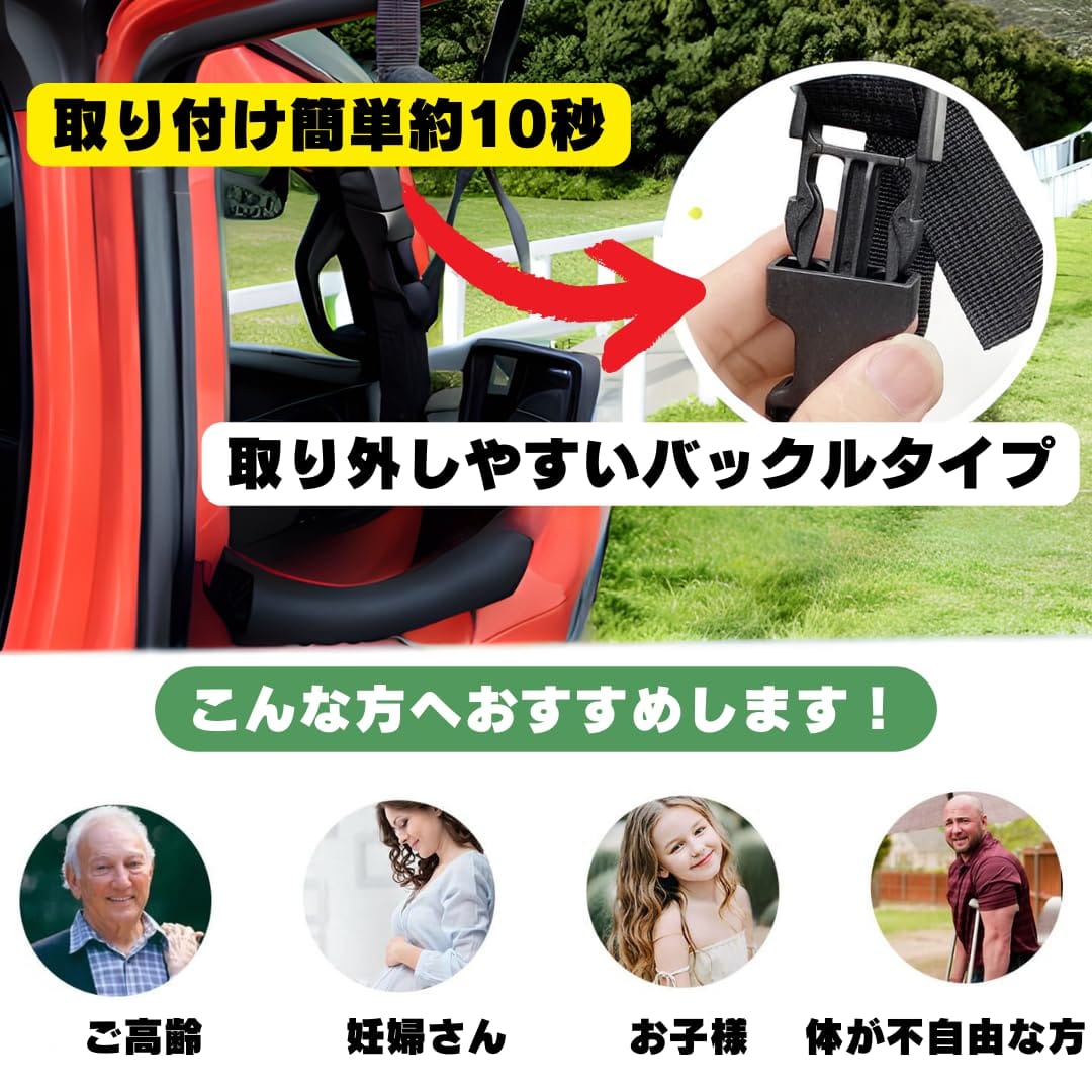 TikTrunkの車用後付け持ち手は、高品質な耐久性のある素材で作られています。強度に優れたプラスチックと丈夫なナイロンストラップを使用しており、長期間の使用にも耐える設計です。どんな車種にも合うようにデザインされており、信頼性と安全性を提供します。本製品のハンドル部分はコンパクトながらも握りやすい形状で、長さは調整可能です。最短25cmから最長38cmまで伸ばすことができ、使用者の体格や車の構造に合わせて最適な長さに調整可能です。また、ストラップの幅は3cmで、安定感を確保します。この補助ハンドルは、高齢者や介護が必要な方、または怪我や病気で体力が低下している方が車の乗り降りをする際に最適です。車のドアフレームに簡単に取り付けられ、使用しないときはコンパクトに収納できるため、スペースを取りません。どんなシーンでも安全で快適な乗り降りをサポートします。TikTrunkの補助ハンドルは、簡単に取り付け可能な設計が特徴です。工具不要で、わずか数分で取り付けられます。また、耐荷重設計により、最大25kgまでの荷重に対応。滑り止め付きのグリップは、しっかりと握れるため、安全性を向上させます。調整可能なストラップで、使用者に最適な長さに調整可能です。実際に使用された方々からは、「車の乗り降りが格段に楽になった」「取り付けが簡単で安心して使える」と好評をいただいています。特に高齢の方や介護が必要な方からは、移動の際の不安が軽減されたとの声が多く寄せられています。TikTrunkの補助ハンドルで、安全で快適な車の乗り降りを実現しましょう。 TikTrunkの車用後付け持ち手は、乗り降りが困難な方に最適な補助ハンドルです。高齢者や介護を必要とする方にとって、車の乗り降りは大変な作業ですが、この補助ハンドルがあれば安心して乗り降りができます。頑丈な耐荷重設計で、最大25kgの荷重に耐えることができます。ハンドルは簡単に取り付けられ、長さも自由に調整可能です。車内のどこにでも取り付け可能で、快適な移動をサポートします。安心して使える高品質な素材で作られており、長期間使用できます。2個セットなので、両側に取り付けてさらに安定感を向上させることができます。TikTrunkの補助ハンドルで、あなたや大切な方の車の乗り降りをもっと簡単に、安全にしましょう。
