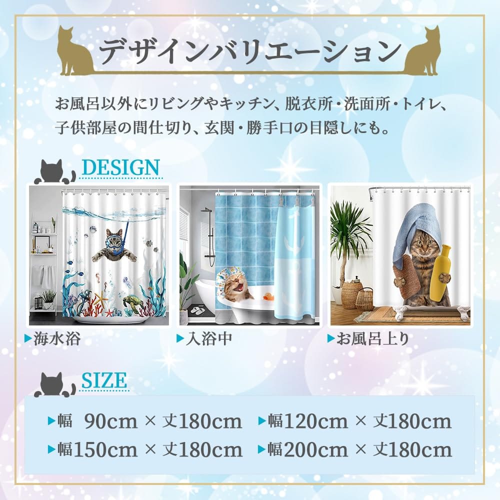 【ねこ柄デザイン】 キュートな猫ちゃんをモチーフとしたおしゃれでかわいいシャワーカーテン(バスカーテン)。 様々なデザイン柄でお風呂を華やかに演出、楽しいバスタイムをお届けします。【撥水・防カビ加工】 撥水・防カビ加工を施したバスカーテンなので使い勝手がとても良く、浴室乾燥で乾かせるためお手入れも簡単です。【幅広い使用用途】 お風呂以外にもリビングやキッチン、脱衣所、洗面所、トイレ、子供部屋など間仕切りとしても使用できます。種類やサイズも豊富のため、収納棚や玄関・勝手口の目隠しとしても幅広くお使い頂けます。【取付簡単】 カーテンフック(リング)付属なので、ポールに通すだけで簡単に取り付けできます。【選べるサイズ】 幅90-丈180cm 幅120-丈180cm 幅150-丈180cm 幅200-丈180cm 【商品詳細】 素材:ポリエステル 仕様:撥水 防カビ パッケージ内容:本体+カーテンリング 【ねこ柄デザイン】 キュートな猫ちゃんをモチーフとしたおしゃれでかわいいシャワーカーテン(バスカーテン)。 様々なデザイン柄でお風呂を華やかに演出、楽しいバスタイムをお届けします。 【撥水・防カビ加工】 撥水・防カビ加工を施したバスカーテンなので使い勝手がとても良く、浴室乾燥で乾かせるためお手入れも簡単です。 【幅広い使用用途】 お風呂以外にもリビングやキッチン、脱衣所、洗面所、トイレ、子供部屋など間仕切りとしても使用できます。種類やサイズも豊富のため、収納棚や玄関・勝手口の目隠しとしても幅広くお使い頂けます。 【取付簡単】 カーテンフック(リング)付属なので、ポールに通すだけで簡単に取り付けできます。 【選べるサイズ】 幅90-丈180cm 幅120-丈180cm 幅150-丈180cm 幅200-丈180cm 【商品詳細】 素材:ポリエステル 仕様:撥水 防カビ パッケージ内容:本体+カーテンリング