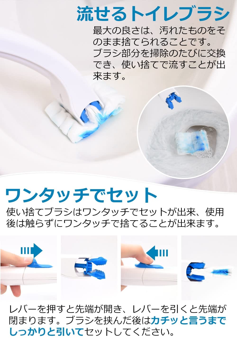 【流せるトイレブラシ】最大の良さは、汚れたものをそのまま捨てられることです。ブラシ部分を掃除のたびに交換でき、使い捨て流すことが出来ます。【衛生的】従来品だと洗って濡れたままのブラシをブラシホルダに入れておくこと、ブラシやホルダ―の中にカビが生えて、今度はブラシホルダ―の掃除をする羽目になってしまい不衛生になりがちですが、「流せるトイレブラシ」は汚れたブラシに触れる必要もなく衛生的。【濃縮洗剤付き】ブラシには濃縮洗剤が付いており、トイレ用洗剤を用意する必要がないのもポイントです。手軽にお掃除できるのでお掃除の頻度が増えトイレをいつも清潔に保てます。【収納と本体の形状】フチ裏など隅々までしっかりと磨きやすいアーチ状になっています。ブラシスタンドの枠は外すことができ、立てる向きを変えられます。流せるトイレブラシのハンドルと替えブラシをセットで収納できる。【セット内容】本体×1、使い捨てシート×12【 30日間の返金保証付き 】 購入日から30日間の返金保証をつけさせていただいておりますので、安心してお買い求めください。 最大の良さは、汚れたものをそのまま捨てられることです。ブラシ部分を掃除のたびに交換でき、使い捨て流すことが出来ます。