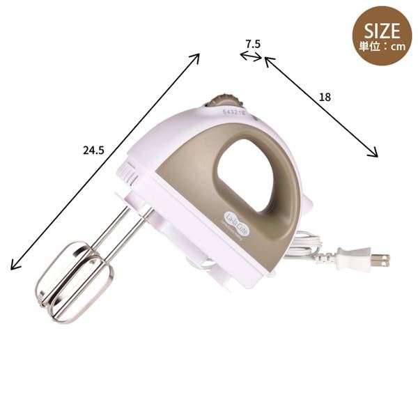 ■サイズ・色違い・関連商品■モカ[当ページ]■ピンク■商品内容生クリームの泡立てやスポンジ生地を作るのに最適なハイパワー120Wの電動ハンドミキサー。収納しにくいコードを本体にグルグル巻きつけてスッキリ収納できます。適度な泡立て、かくはんを可能にした5段階スピード調節。スイッチ部を押すだけでビーターが簡単に外せます。■商品スペック【製品サイズ(約)】使用時:幅75×奥行180×高さ245mm(ビーター含む)収納時:幅75×奥行195×高さ180mm【重量(約)】850g【材質】本体・ケース:ABS樹脂(耐熱温度80度)ビーター:ステンレス鋼【特徴・機能】5段階スピード調節【電源】100V 50/60Hz【消費電力】120W【定格時間】7分(95度サーモスタット付)【有効コード長さ】1.5m【生産国】中国【カラー】モカ■送料・配送についての注意事項●本商品の出荷目安は【2 - 6営業日 ※土日・祝除く】となります。●お取り寄せ商品のため、稀にご注文入れ違い等により欠品・遅延となる場合がございます。●北海道への配送につきましては別途追加送料が発生します。 また沖縄県・離島へは配送不可となります。[ D-1126 ]