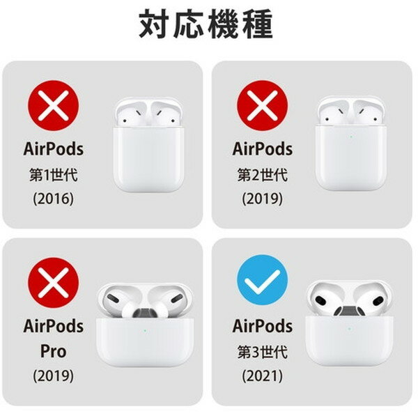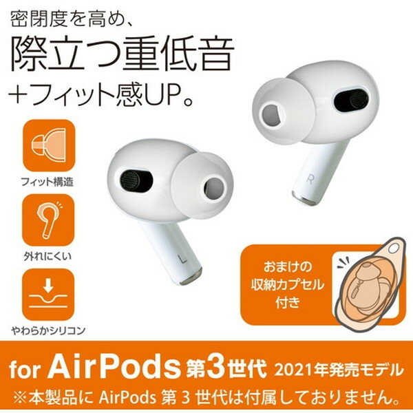 商品説明★ 重低音が際立つ、密閉力の上がるカナル構造を採用したAirPods (第3世代)用イヤホンカバーです。★ 耳の中でしっかり固定されるカナル構造を採用しています。★ AirPods (第3世代)にぴったり固定でき外れにくくなっています。★ 使用時に快適なやわらかシリコン素材を採用しています。★ 充電する際にイヤホンカバーを外して一時保管できる便利な収納カプセル付です。※本製品をAirPods (第3世代)に装着したまま、充電ケースに収納することはできません。スペック* 対応機種:AirPods 第3世代(2021年発売モデル/ワイヤレス充電対応タイプ)* セット内容:イヤホンカバー×1セット、収納カプセル×1* 材質:シリコン