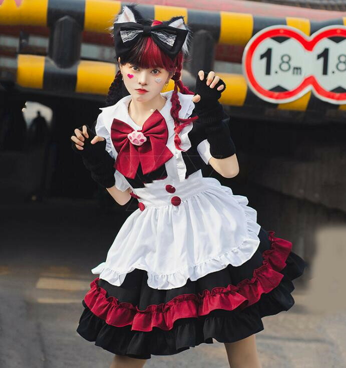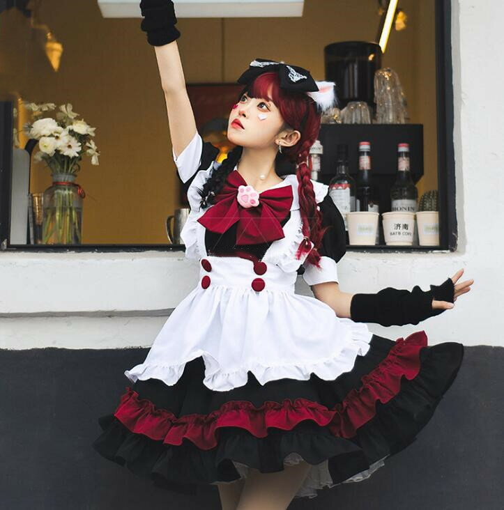 メイド服 ゴシック風 メイド服 黒赤 ハロウィン コスプレ衣装 ゴスロリ 暗黒風メイド服 コスチューム 変身仮装 コス お化け 魔女 コスプレ パーティー衣装 文化祭 ティアードワンピース