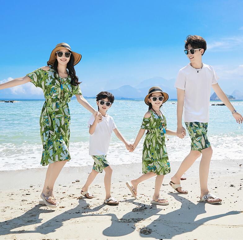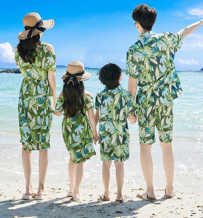 親子ペア 夏服 海旅行 衣装 アロハシャツ 木の葉柄 半袖ドレス カップル プレゼント Tシャツ 半ズボン 親子コーデ アロハ シャツ ビーチドレス 家族お揃い衣装 新婚旅行 親子 ペアルック 家族活動 グリーン