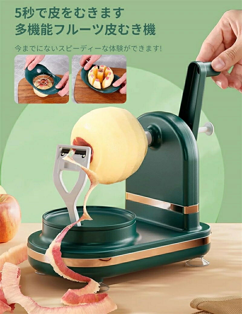 ポクミル アップルピーラー 果物削り フルーツピーラー ハンドルを回すだけ 半自動 360度回転式 多機能りんごスライサー 皮むき器 オレンジ 吸盤付き 便利 キッチン用品 フルーツカッター 果物 野菜