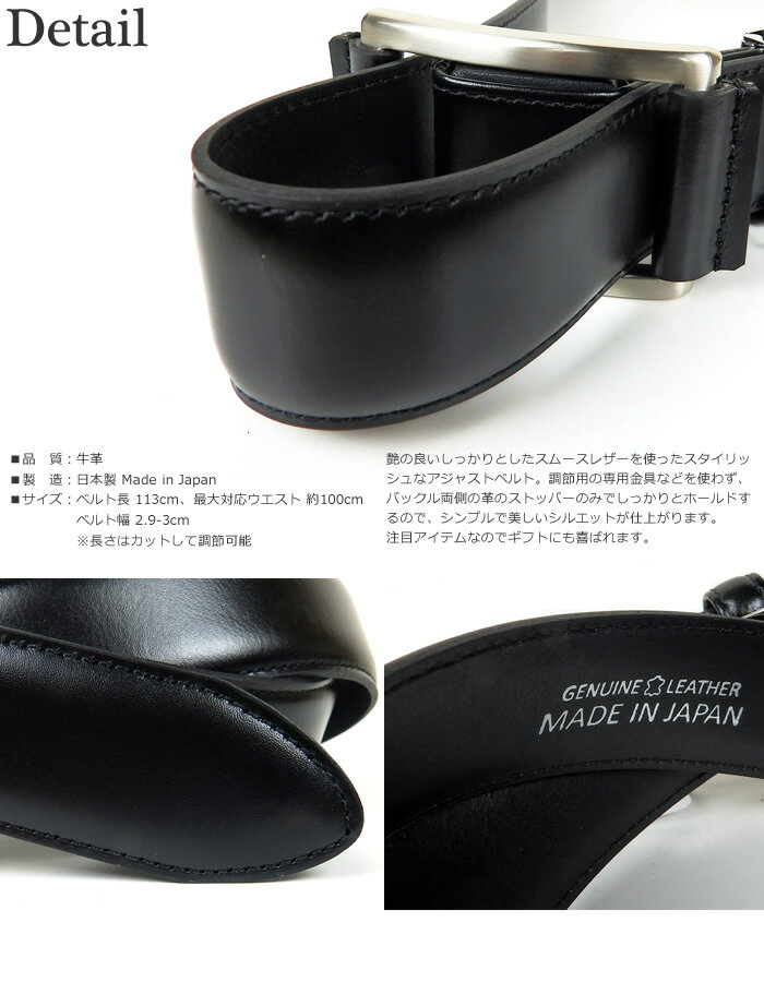 ◆ 特徴 艶の良いしっかりとしたスムースレザーを使ったスタイリッシュなアジャストベルト。調節用の専用金具などを使わず、バックル両側の革のストッパーのみでしっかりとホールドするので、シンプルで美しいシルエットが仕上がります。 注目アイテムなのでギフトにも喜ばれます。 ◆ デザイン 無地 ◆ サイズ ベルト長 113cm、最大対応ウエスト 約100cm(カット可) ベルト幅 2.9-3cm ◆ 品質 牛革 ◆ 生産 日本製 Made in Japan ■商品の発送について(必ずお読みください。) こちらの商品は1〜3営業日程度(土日祝日は除く)での発送となります。商品の在庫管理には十分注意しておりますが、実店舗でも販売をしています関係上、在庫数の反映が間に合わない場合があります。万が一品切れとなってしまった場合は、あらかじめご了承下さい。