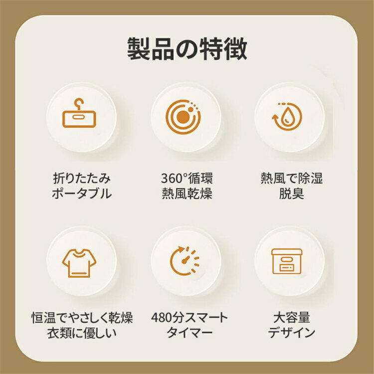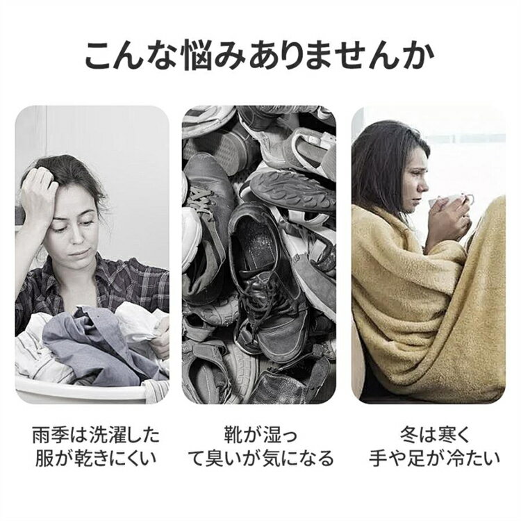 商品詳細 商品説明 【多機能 3in1 生活をサポート】 衣類乾燥機、靴乾燥器、セラミックヒーターとして 3 つの機能を 1 台で実現。衣類の乾燥・脱臭、靴の乾燥・臭い除去、手や足の暖房まで幅広く活用でき、様々な生活シーンに対応します。 【操作簡単 遠隔操作も便利】 簡単パネルで直感的に操作可能で、付属のリモコンで 5m 先から遠隔操作もできます。タッチ操作で設定変更がスムーズで、お年寄りや子供でも容易に使いこなせ、利便性を最大化します。 【省エネ高効率 経済的使用】 600W の高効率省エネ設計で、1 時間あたり 1kWh 未満の電力消費。暖房や乾燥作業を長時間行っても電気代が気にならず、経済的かつ安心してご使用いただけます。 【360° 熱風循環 大容量一括乾燥】 360° 全行程熱風循環で衣類全体を均一に乾燥し、日当たりの悪い日でもふんわり柔らかく仕上がります。コンパクトながら大容量で、下着、赤ちゃん服、T シャツなど複数の衣類を一度に乾燥できます。 【製品仕様】 製品名:多機能衣類乾燥機 電源コード長さ:200cm 消費電力:600w 本体重量:500g 対象:衣類、布団カバー、靴 ご注意 ※運送の状況により、まれに外箱が潰れる場合がございます。 ※商品や配送に関して気になる点や不具合がございましたら、お手数ですが、まずは当店までご相談ください。 ※製品の仕様は予告なく変更されることがありますので、予めご了承ください。 ※商品写真はできる限り実物の色に近いようにしておりますが、パソコンの画質や光線環境により実際の商品と色味・素材感が多少異なる場合がございますので、予めご了承ください。 ※測り方によって1-2cmの誤差が生じる場合がございます。 ※当店の在庫は、店舗と共有しており日々流動的に動いております。商品によっては、弊社運営の多店舗と在庫を共有しているものございます。そのため、ご注文時に在庫があっても、タイミングによっては既に完売、欠品の場合がございます。完売、欠品の場合には連絡の上、ご注文キャンセルか入荷をお待ち頂くかのご希望を確認させて頂きます。