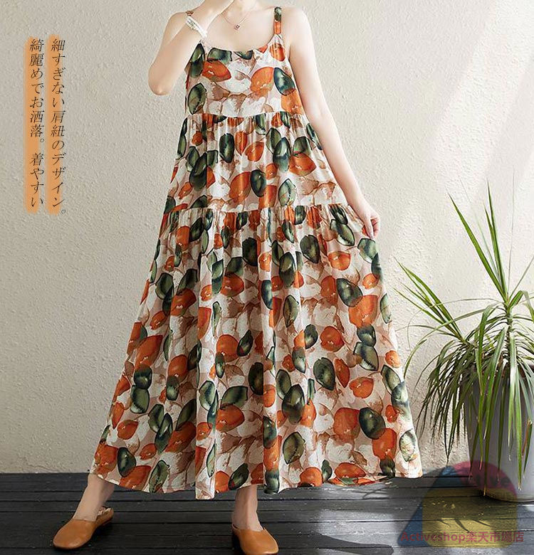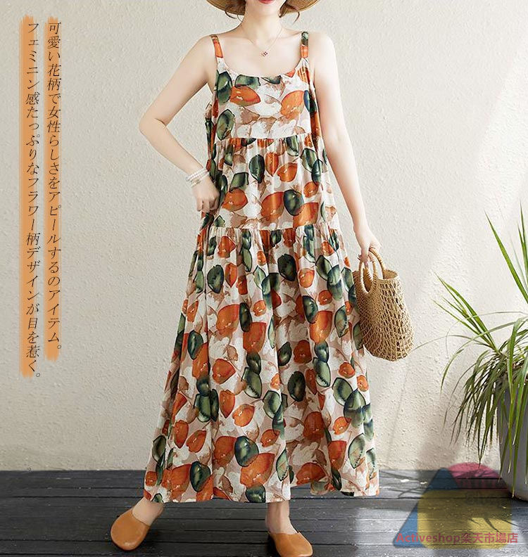 キャミワンピース ロング レディース 花柄ワンピース キャミソール ノースリーブ タック ギャザー ラウンドネック Aライン ロングワンピース ゆったり 大きいサイズ マキシ丈ワンピース 無地 プルオーバー 花柄 体型カバー シンプル カジュアル 送料無料