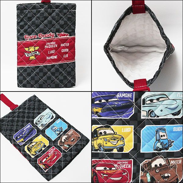Disney Pixar Cars ディズニー・ピクサーの大人気映画『カーズ』のシューズケースです! ライトニング・マックィーンやメーター、ルイジ、グイド、ラモーン、フローたちがプリントされたカワイイデザイン☆ 内側には名前を記入できるネームタグが付いています♪ 学校用の上履きや体育館シューズ、運動靴入れに最適◎ これからの入園・入学・新学年時期にぴったりなキルティングシューズバッグです! 【サイズ】21×30cm 【重量】80g 【素材】ポリエステル100% 【生産国】中国