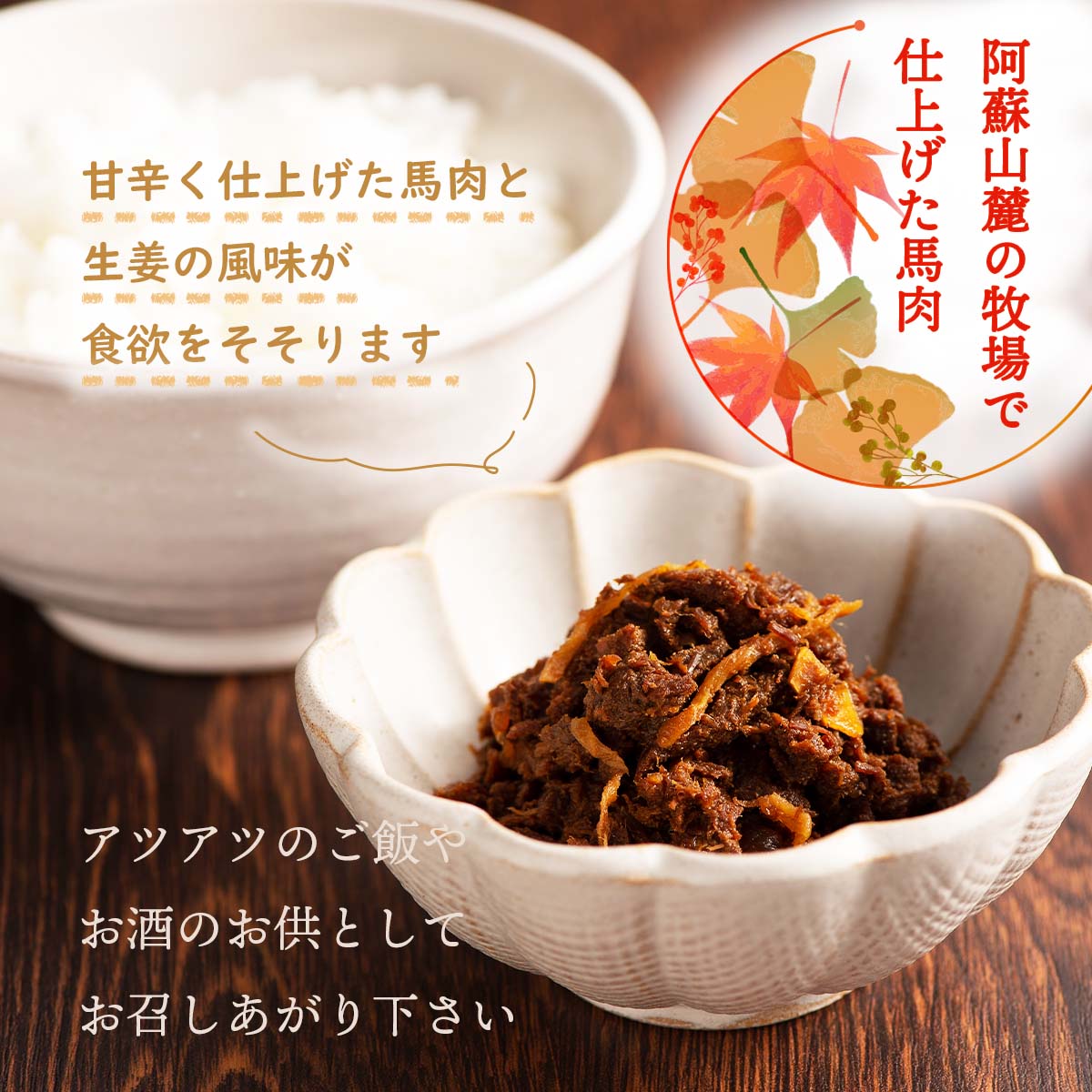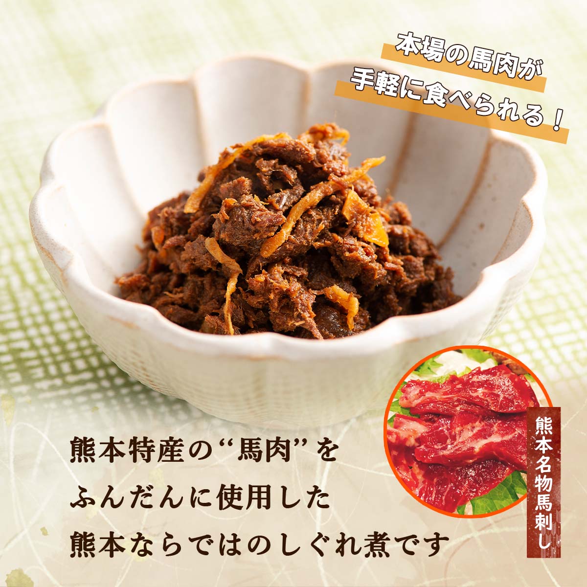 メーカー名 フジチク 内容量 80g 原産国・製造国 日本、ほか 賞味期限 製造日より360日 アレルゲン 大豆、小麦 商品説明 熊本特産の「馬肉」をふんだんに使用した熊本ならではのしぐれ煮です。甘辛く仕上げた馬肉と生姜の風味が食欲をそそります。アツアツのご飯やお酒のお供としてお召しあがり下さい。〜特別な時間を、フジチクのお肉で〜 本場・熊本の馬刺し通販、お取り寄せなら「フジチク」にお任せください。熊本に直営店が2店舗、創業40年の実績、 自然に囲まれた阿蘇山麓の牧場で仕上げた馬刺しだから 品質と味の豊かさが圧倒的に違います。ご自宅用からお中元、お歳暮など、大切な方へのギフトにも、 最高級の馬刺しを新鮮な状態で全国にお届けいたします。