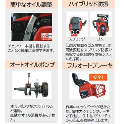 手軽な枝打ち作業から、本格作業用までラインナップ!!●簡単なオイル調整チェンソー本機を反転することなく簡単に調整できます。●ハイブリッド防振低周波振動をゴム防振で、高周波振動をスプリング防振で吸収する総合的な防振システムを採用。●オートオイルポンプオイルポンプがクラッチドラムと連動。無駄なオイル消費がありません。●フルオートブレーキ作業中キックバックが起きた際、慣性力でチェンブレーキが作動し、0.1 秒でソーチェンの回転を強制停止します。 メーカー 丸山製作所 型式 MLC3501R(14)-1 JANコード 2100000603909 形式 リヤハンドル 質量 4.2kg エンジン排気量 34.9cm3 燃料タンク容量 034L ソーチェン/リング数 25AP/76E ガイドバー種類 スプロケットノーズバー