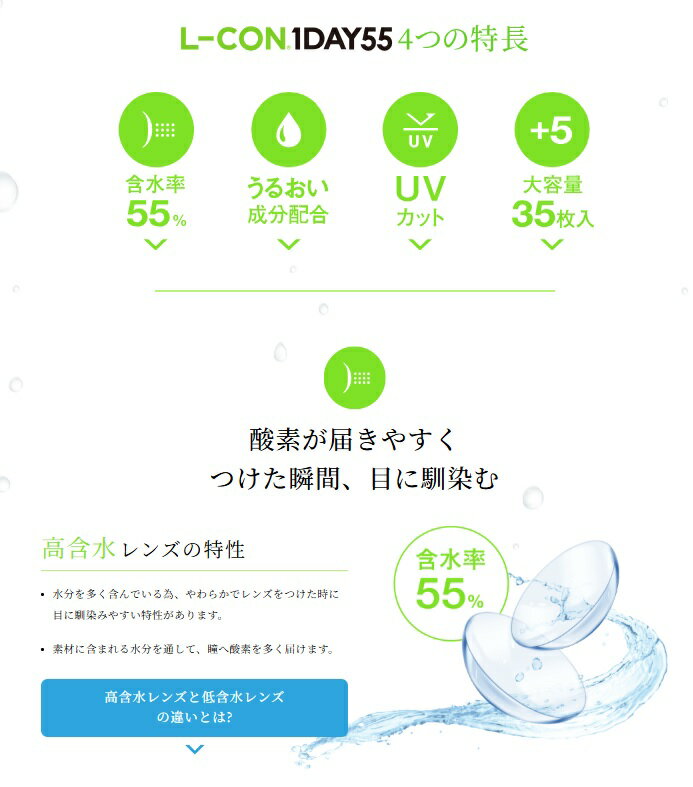 今日もしっとり、ソフトな瞳 高含水率レンズの保存液に2種類のうるおい成分を配合。UVカット機能で大切な瞳を紫外線から守ります。 内容量:1箱35枚入り 規格 ◆使用期限:1日 ◆DIA(直径):14.0mm ◆BC(ベースカーブ):8.7 9.0mm ◆中心厚:0.08mm(-3.00D) ◆POWER:-0.50〜-6.00(0.25ピッチ) -6.50〜-12.00(0.50ピッチ) ◆含水率:55.0% ◆医療用具承認番号 22900BZX00076A03 ◆使用目的/矯正種別:視力補正用レンズ(終日装用/近視用) ◆販売元:株式会社シンシア 広告文責 オクト アイアイマーケット 0940-52-2449 輸入販売元 株式会社シンシア 製造国 海外製(レンズ外箱に記載) 区分 高度管理医療機器 ※コンタクトレンズは、改正薬事法第2条 第5項に分類を定めた高度管理医療機器に なっており、販売には県知事の許可が必要 で、当店は福岡県知事より高度管理医療機 器の販売営業許可を得ています。 医療機器承認番号 22900BZX00076A03
