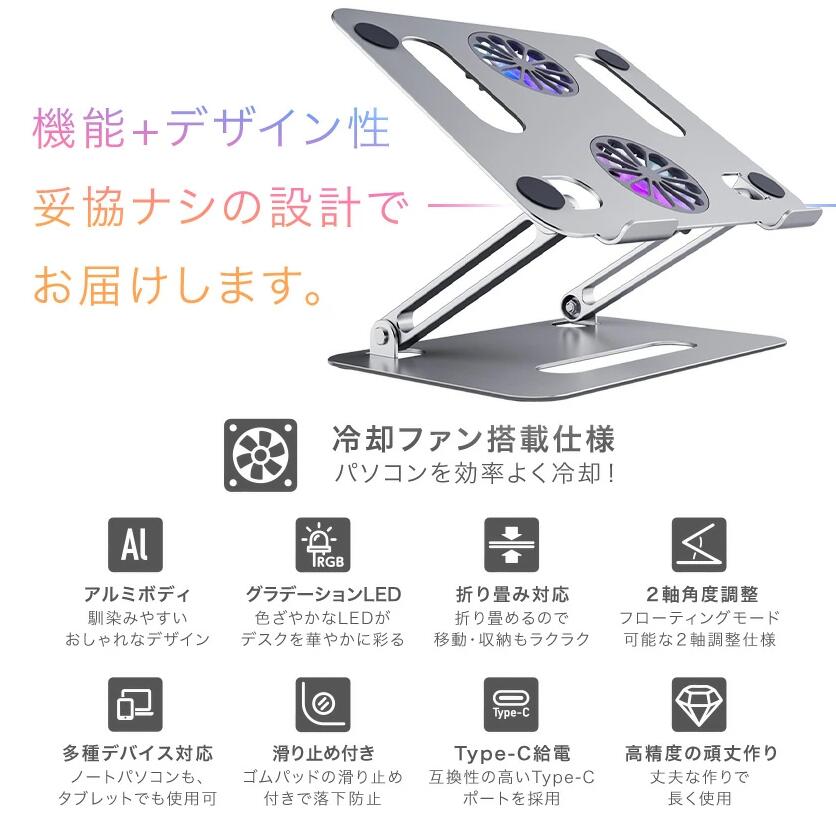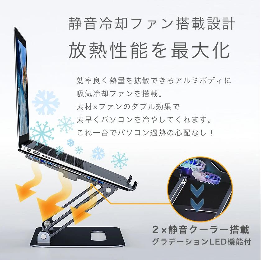 ノートパソコンスタンド タブレットスタンド 冷却台 折りたたみ式 高さ調節可 角度調整可 縦置き 優れた放熱性 静音設計 軽量 滑り止め LEDライト パソコン ゲーミング 事務室 自宅 おしゃれ PC周辺