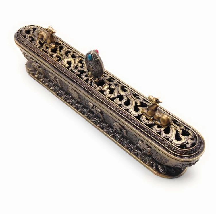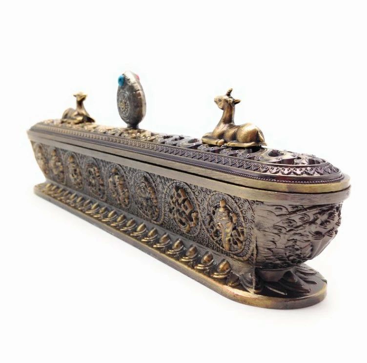 とても珍しいチベット式の長細いボックス型の香炉です。 容器の側面片側には八吉祥と呼ばれる物がデザイン、もう片方はチベット文字がデザインされています。 蓋にはチベット寺院のデザインによく見られる、二匹の鹿と法輪モチーフ付きです。 珍しい工芸品風の置物として飾っておかれるのも良いですね。 アジアン風のお店などのディスプレイ用にもオススメです。 素材 合金 サイズ 約23.6×4.5×8.2cm お香は撮影用ですので商品に含みません。