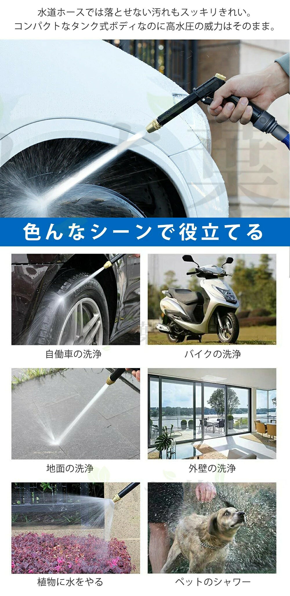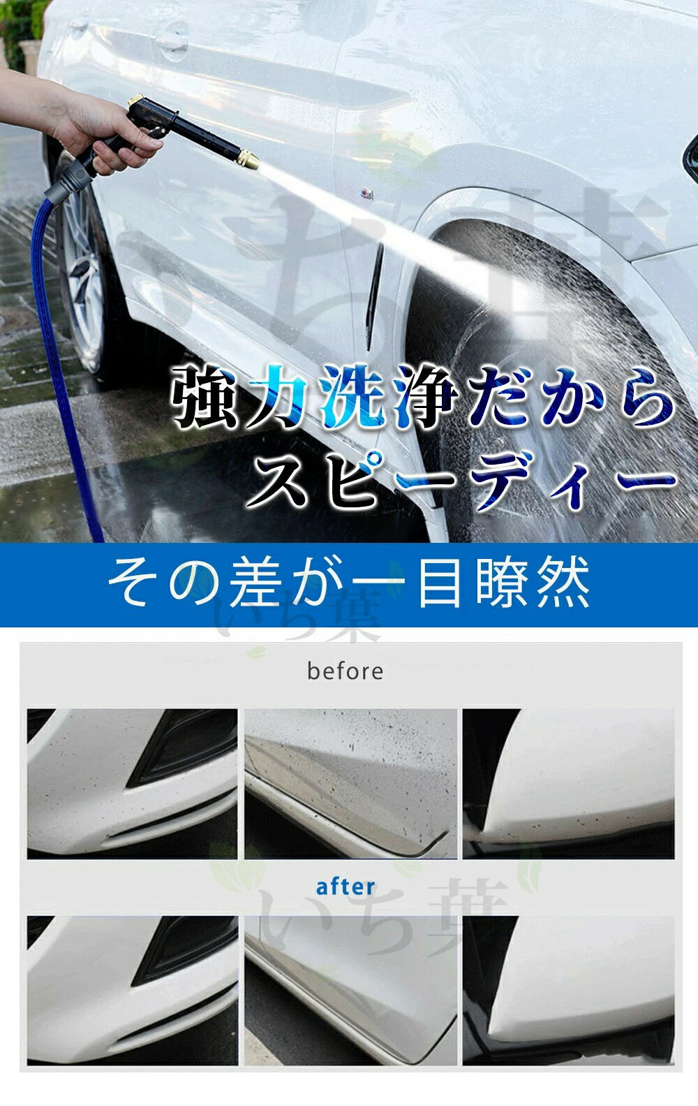 ★浴室の隅や隙間に溜まった水垢やホコリはもちろん、排水口のヌルヌル汚れ、手やブラシの届かない浴槽エプロン内部の奥についた汚れも本機で一掃できます。お風呂の残り湯も使えるのでエコで経済的です。 ★窓や網戸は、花粉やホコリがまとわりついて汚れがちです。なかなか上手く洗えなかったり、取り外して洗おうとすると、非常に手間がかかります。本機なら、高圧水で流すだけで面倒な窓・網戸掃除が一気に完了です。 ★手洗い洗車を行う際は、足回りを洗うためしゃがみこんだり中腰の姿勢になったりと意外と疲れます。本機を使えば水を当てるだけで砂やホコリなどの汚れがキレイになります。 ★高圧噴射! 水道水の水圧を高めて、6〜8mの距離まで噴射することができるんですよ。 水量が多いので、車の隙間に溜まったスラッジも簡単に流せます。 ★ご使用後、水を全部放水するとマジックホースのが元のサイズに戻りますので、とっても軽く、保管スペースを節約することができます。 注意事項 ※写真は実物と同じように撮影されます。撮影中の光とモニターの解像度が異なるため、多少の色の違いは品質上の問題ではございませんので、予めご了承ください。 ※お問い合わせとメールを承りますので、質問や苦情を相談して有効に解決しましょう。必ず責任を持って最後までご対応致します。勝手に悪いレビューをしないでお願い致します。 ※環境配慮と迅速なお届けのため、簡易包装で発送しております。運送事故により箱が潰れる可能性がございます。万が一不具合やご不明点がございましたら、どうぞお気軽にご連絡ください。誠意をもって対応させていただきます。 ※配送または仕入状況により商品の箱に凹み、スレ等がある場合がございます。輸入品の為、多少の汚れ、スレがある場合がございます。(製品の動作に問題ございません。)パッケージ不良による交換返品は対応出来かねますので、ご了承をお願いします。 ※手動測定による1~2cmの誤差を許容してください。ご理解いただきありがとうございます ※取り扱い上のご注意をよくお読みの上ご使用下さい。