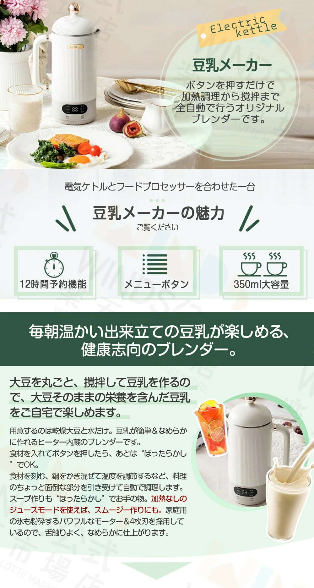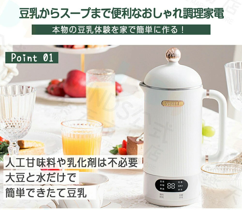商品詳細 ●ヒーター内蔵で食材を加熱しながら刻んで撹拌する高機能ブレンダー。パワフルに高速回転するモーターを内蔵。ステンレスの4枚刃で細かく食材を刻みながら、ヒーターで加熱していきます。ヒーターはメニューに合わせて温度を自動でコンロトール! ●食材を刻む、鍋をかき混ぜて温度を調節するなど、料理のちょっと面倒な部分を[豆乳メーカー]が引き受けてくれるから、食材を入れたらあとは“ほったらかし”でOK。 ●食材を細かく刻み&撹拌しながら、温度を自動調節して加熱するので、なめらかな豆乳やスープなどが手間なく簡単に作れます。 ●12時間予約機能があるので、夜で食材を入れて、翌日の朝で新鮮な豆乳をすぐに楽しむことができます。 ●家庭用の氷も砕けるので、スムージーなど冷たいメニューもOKです。 注意事項 ※写真は実物と同じように撮影されます。撮影中の光とモニターの解像度が異なるため、多少の色の違いは品質上の問題ではございませんので、予めご了承ください。 ※お問い合わせとメールを承りますので、質問や苦情を相談して有効に解決しましょう。必ず責任を持って最後までご対応致します。勝手に悪いレビューをしないでお願い致します。 ※環境配慮と迅速なお届けのため、簡易包装で発送しております。運送事故により箱が潰れる可能性がございます。万が一不具合やご不明点がございましたら、どうぞお気軽にご連絡ください。誠意をもって対応させていただきます。 ※配送または仕入状況により商品の箱に凹み、スレ等がある場合がございます。輸入品の為、多少の汚れ、スレがある場合がございます。(製品の動作に問題ございません。)パッケージ不良による交換返品は対応出来かねますので、ご了承をお願いします。 ※手動測定による1~2cmの誤差を許容してください。ご理解いただきありがとうございます ※取り扱い上のご注意をよくお読みの上ご使用下さい。