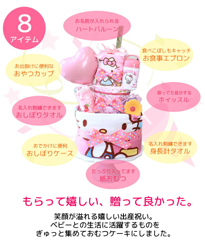 ギフト対応 商品名 ハローキティ3段おむつケーキ セット内容 ・紙おむつ(メーカー/サイズ選択可能) ・湯上げタオル(名前刺繍可能) ・おしぼりタオル(名前刺繍可能) ・おしぼりケース ・お食事エプロン ・フラワーホイッスル ・おやつカップ ・ハートバルーン(名入れ無料) ・ラッピング 【有料オプション】 ・身長計湯上げタオルの刺繍 ・おしぼりタオルの刺繍 おむつメーカー/サイズ パンパースSテープ 30枚 パンパースMテープ 27枚 パンパースLパンツ 22枚 メリーズSテープ 27枚 メリーズMテープ 24枚 ムーニーSテープ 29枚 ムーニーMパンツ 22枚 グーンSテープ 29枚 サイズ おむつケーキ本体:横約36cm×縦約41cm ラッピング込:横約36cm×縦約44cm ひとつひとつ手作業でお作りしております。 ご選択のおむつサイズやラッピングの仕方により多少の誤差がございますことご了承くださいませ。 無料サービス ・バルーンの名入れ ・ラッピング ・メッセージカード ・熨斗 ・送料無料(一部地域除く) 【即日発送 対象商品】 名入れ刺繍をご希望の場合も営業日13:00までのご注文・決済完了で即日発送いたします。 メッセージカードについて ご希望のお客様はご注文確定前の「メッセージカード記入欄」にご記入下さい。 ※絵文字や記号は文字化けする可能性があります。 絵文字や特殊文字はご使用にならないようお願いいたします。 オプションなどの料金追加について オプションなどの追加料金は楽天のシステム上、ご注文時に金額が反映されません。 価格変更が必要な場合には、当店にてご注文確認後にオプション代を追加し価格変更したメールをお送りいたします。 必ずご確認くださいますようお願いいたします。 明細書・領収書について 全てのご注文に対し金額のわかる明細書などは発行しておりません。 領収書が必要な方は商品発送後にご自身の購入履歴より印刷可能でございます。 その他 風船は約1ヵ月〜2ヵ月程はお楽しみ頂けます。 商品そのものの色を表現できるよう努力しておりますが モニター、環境、設定などで、若干違う場合がございます。 ひとつひとつ手作業で製作しておりますので 配置等若干の誤差がある場合が御座いますが予めご了承ください。 ※基本的には土日は休業です。 長期休暇時など変更する場合がございますので当店営業カレンダーをご確認ください。 用途 ・出産祝い ベビーシャワー(baby shower) ・誕生日 ハーフバースデー 1歳 ファーストバースデー ・卒業 卒園 入学 入園 退職 退院祝い ・初節句 端午の節句 ひなまつり 桃の節句 ・バレンタイン ホワイトデー 母の日 父の日 クリスマス 友人 友達 上司 部下 先輩 後輩 同僚 先生 孫 兄弟 姉妹 娘 息子 甥 姪 100日 新生児 双子 子供会 保育園 幼稚園 お誕生日プレゼント 刺繍