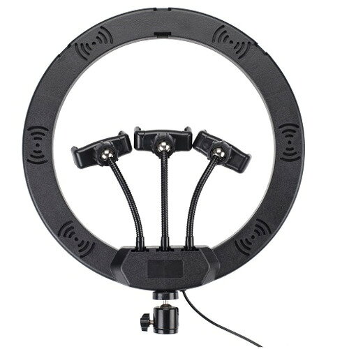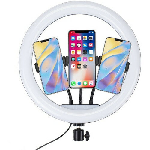 グリーンハウス GH-CSL120E-BK LEDリングライト12インチ・120灯(三脚無し) ブラック発売日:2021年4月15日●ビデオ会議や動画撮影をサポート顔全体に万遍なく光を当てて不要な影を消すことで、ビデオ会議や動画撮影時に映る表情が健康的で明るくなると共に、ライトを円形にすることで瞳の中に白い輝きを生む「キャッチライト」を入れることができるので、生き生きとした輝きのある表情を演出することができます。●シーンで選べる3段階の色調モードに対応撮影シーンや雰囲気に応じて3段階から選べる色調モードを搭載しています。オンライン飲み会や仕事の合間の雑談の時などリラックスしたい時に最適な電球色モード、重要な会議など集中力を高めたい時に最適な昼光色モード、自然な肌の色でオンライン商談や社内外のミーティングに最適な昼白色モードをボタン一つで切り替えてご利用いただけます。●明るさは10段階で調節可能ビデオ会議の時は周囲の明るさに応じた柔らかい光を、料理や商品の撮影の時には明るさを最大化するなど10段階で光の強さを調整できるため様々なシーンで利用できます。●用途に応じた三脚を使用可能です(本製品に三脚は付属しておりません)不要な影を消して理想的な照明環境を作るためには、顔全体に光を万遍なく当てることが重要です。通常正面にノートパソコンを配置するため、理想的な照明を実現するためにはディスプレイ越しに照明器具を設置する必要があります。付属の三脚は高さを約1.2mまで伸ばせるため環境に合せて最適な高さに調節してご利用いただけます。●スマートフォン単体でのライブ配信に便利なホルダー3個付属パソコンでのビデオ会議だけでなく、スマートフォンを使ったライブ動画配信やショートビデオコミュニケーションで利用いただけるよう、幅55〜85mmまで、厚さ7.5mm以下のスマートフォンを取り付けてご利用いただけるスマートフォンホルダーを標準添付しました。【仕様】対応機種:USBインターフェース搭載機器LED灯数:120個明るさ:10段階調節(1440〜2760LM)色調整:3色(白、暖色、ミックス)色温度:2700K〜6500K電源:DC 5V(USBポートより供給)消費電流:2A(最大)ケーブル長:約190cm外形寸法:約 W320 x D30 x H360mm重量:約294g(本体のみ)スマートフォンホルダー取り付け幅:55〜85mmスマートフォンホルダー耐荷重:約1000g保証期間:6ヶ月間