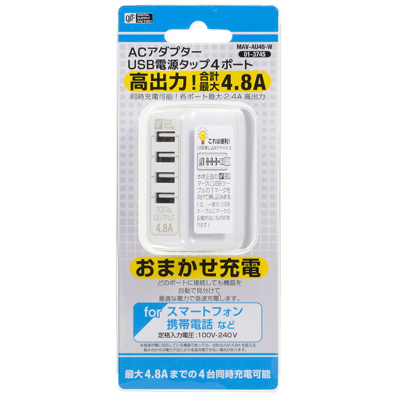 オーム電機 ACアダプター USB電源タップ 4ポート ホワイト MAVAU48W