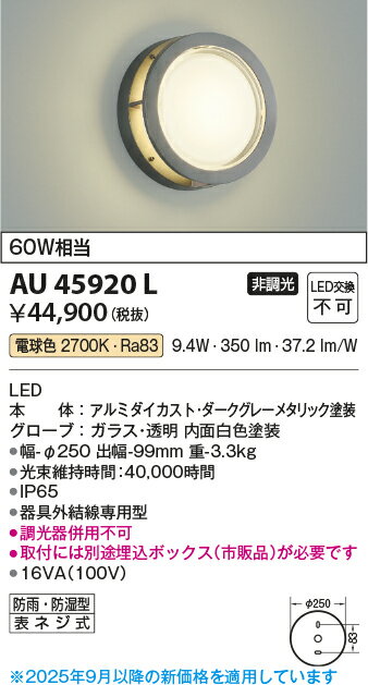 こちらの商品は外箱を開封された場合、返品交換を承ることは出来かねます。(不良商品の場合は除く) 商品の品番・仕様等を充分にご確認頂いた上でご注文ください。その他条件に付きましては支払・配送方法をご確認ください。 メーカー:KOIZUMI/コイズミ照明 LED内蔵 電球色 2700K 本体:アルミダイカスト・ダークグレーメタリック塗装 グローブ:ガラス・透明内面白色塗装 幅-φ250 出幅-99mm 重-3.3kg 消費電力:10.0W 定格光束:315 lm 固有エネルギー消費効率:31.5 lm/W 演色性:Ra83 光源寿命:40,000時間 IP65 調光器併用不可 器具外結線専用型 取付には埋込ボックスが必要です。市販のものを別途お求めください。 ※こちらの商品は取付工事が必要です。KOIZUMILED防雨型ブラケット ダークグレーメタリック塗装 AU45920L