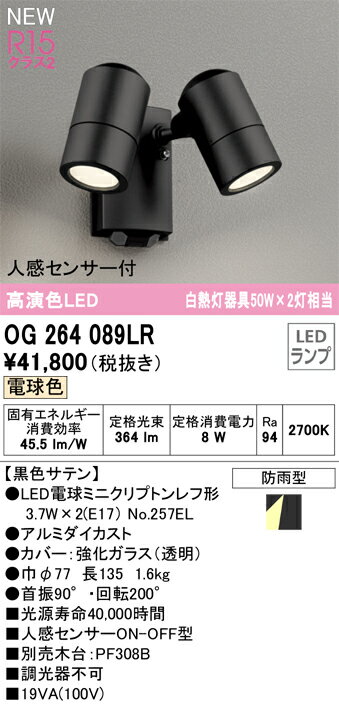 ODELIC エクステリアライト(スポットライト) LEDランプ付 白熱灯器具50W×2灯相当 直付 電球色 2700K 高演色LED 防雨型 人感センサー付 黒(ブラック) OG264089LR