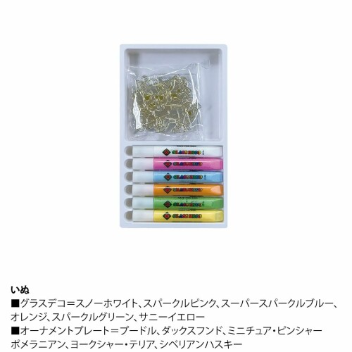 ヤマト グラスデコ オーナメントセット いぬ GDS6-D1 【1本容量】10.5ml 【色数】6カラー 【セット内容】グラスデコ (10.5ml ×6本):スノーホワイト、スパークルピンク、スーパースパークルブルー、オレンジ、スパークルグリーン、サニーイエロー オーナメントプレート(6コ):プードル、ダックスフンド、ミニチュア・ピンシャー、ポメラニアン、ヨークシャー・テリア、シベリアンハスキー ※ふちどりのカラーはゴールド 【特長】 付属の透明プレートにお好きな色のグラスデコを塗って乾かす(約8時間)だけでカラフルできれいなオーナメントが簡単に作れ、塗り絵感覚で楽しめます。 いぬのオーナメント6種が入ったセットになります。 【ご注意】 プレート自体に縁取りがあるため、縁取り兼用グラスデコ(ブラック、ゴールド)はセットに入っておりません。 ステンドグラス風のオーナメントが作れるグラスデコオーナメントセットいぬバージョン! カラフルな作品が楽しめるオーナメント6コ、グラスデコ6本入り。 ペン型で持ちやすいボトルに入った、気軽に楽しめるタイプです! 付属の透明プレートにお好きな色のグラスデコを塗って乾かすだけでカラフルなオーナメントが仕上がります。 商品コード39076791614商品名ヤマト グラスデコ オーナメントセット いぬ GDS6-D1型番GDS6-D1サイズいぬカラーいぬ※他モールでも併売しているため、タイミングによって在庫切れの可能性がございます。その際は、別途ご連絡させていただきます。※他モールでも併売しているため、タイミングによって在庫切れの可能性がございます。その際は、別途ご連絡させていただきます。