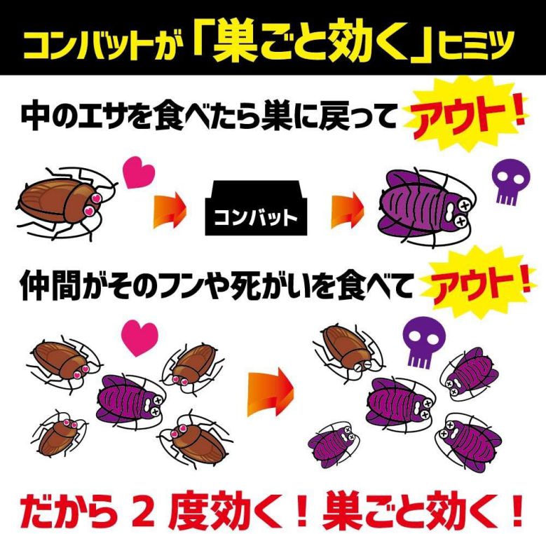商品名 コンバット 1年用 4個入 N ゴキブリ 殺虫剤 大型容器 防除用医薬部外品 ごきぶり 退治 駆除 キンチョー 大日本除虫菊 【×10個セット】 商品説明 1個で広い範囲にしっかり効き、巣にいるゴキブリも駆除する「2度効く」効果●8つの特長(1)大型・小型、どんなゴキブリにも効く。(2)しぶとい抵抗性ゴキブリに効く。(3)メスのもつ卵に効く。卵を持ったチャバネゴキブリの卵にも効く!(4)大型容器で広く効く。(5)2度効く!巣ごと効く!巣に戻って他のゴキブリにも効く!(※使用環境により効果は異なります。)(6)1個でもしっかり効く。(7)イースト成分・バナナ香料配合で誘って食べさせる!(8)タテでも貼れる固定テープ付き。●ゴキブリ連鎖駆除効果:コンバットが「巣ごと効く」理由1.コンバットの誘引作用でゴキブリが容器に入り、中のベイト剤(エサ)を食べます。2.そのゴキブリが巣に戻ってフンをし、死んでいきます。フンや死骸の中には有効成分が残っています。巣の中の仲間や幼虫がそのフンや死骸を食べて死にます。だから、コンバットは2度効く!巣ごと効く!●薬剤に触れない。●置くだけ簡単。●バナナ香料配合。●効果1年。●4個入。【効能 効果】ゴキブリの駆除【用法 用量】10平方メートルにつき1〜2個を設置する。【使用方法】・袋を開封し、本品を1個ずつ切り離し、ゴキブリの生息場所や通り道の壁や角にピッタリくっつけて置いてください。・10平方メートル(約6畳)あたり1〜2個置いてください。・壁やスキマ等狭い場所には容器底の固定テープのはく離紙をはがして垂直に設置してください。・使用開始時に容器に 貼ってあるラベルに開始年月日をご記入ください。本品の効力は開封後約1年です。1年を目安にお取り替えいただくと、より安定した効果が継続的に得られます。・設置した本品やその周辺には、スプレー等薬剤をかけないでください。・使用しないコンパットは袋に戻し、テープなどで密封して保管してください。■設置場所台所、トイレ・洗面所・洗濯機、ベランダ【成分】有効成分:ヒドラメチルノン:2.00w/w%その他の成分:果糖、ハチミツ、賦形剤、ソルビン酸K、ソルビン酸、水、乾燥酵母、香料、他4成分【注意事項】注意:人体に使用しないこと・定められた用法・用量を厳守してください。■してはいけないこと・容器から内容物を取り出して使用しないでください。■相談すること・万一誤って食べた場合は、すぐに吐き出させ、直ちに本品がヒドラメチルノンを含有する製剤であることを医師に告げて診療を受けてください。■その他の注意・水のかからない場所に置いてください。・皮膚、飲食物、小児のおもちゃ、飼料等に触れないようにしてください。・薬剤が手に触れたときは石けんと水でよく洗ってください。・使用中は小児やペットがもてあそばないよう注意してください。■保管及び取り扱い上の注意・使用中や保管の際は食品と区別し、誤って食べないよう十分注意してください。・直射日光を避け、小児の手のとどかないところに保管してください。・容器は使用後、自治体の指示に従って適切に廃棄してください。・容器を切り離す際、手を切らないようご注意ください。・固定テープを使用後はがす際は、接着面を傷つけないようご注意ください。【原産国】韓国※リニューアルなどによりパッケージなどの仕様が予告なく変更になる場合がございます。ご了承ください。 おすすめ商品