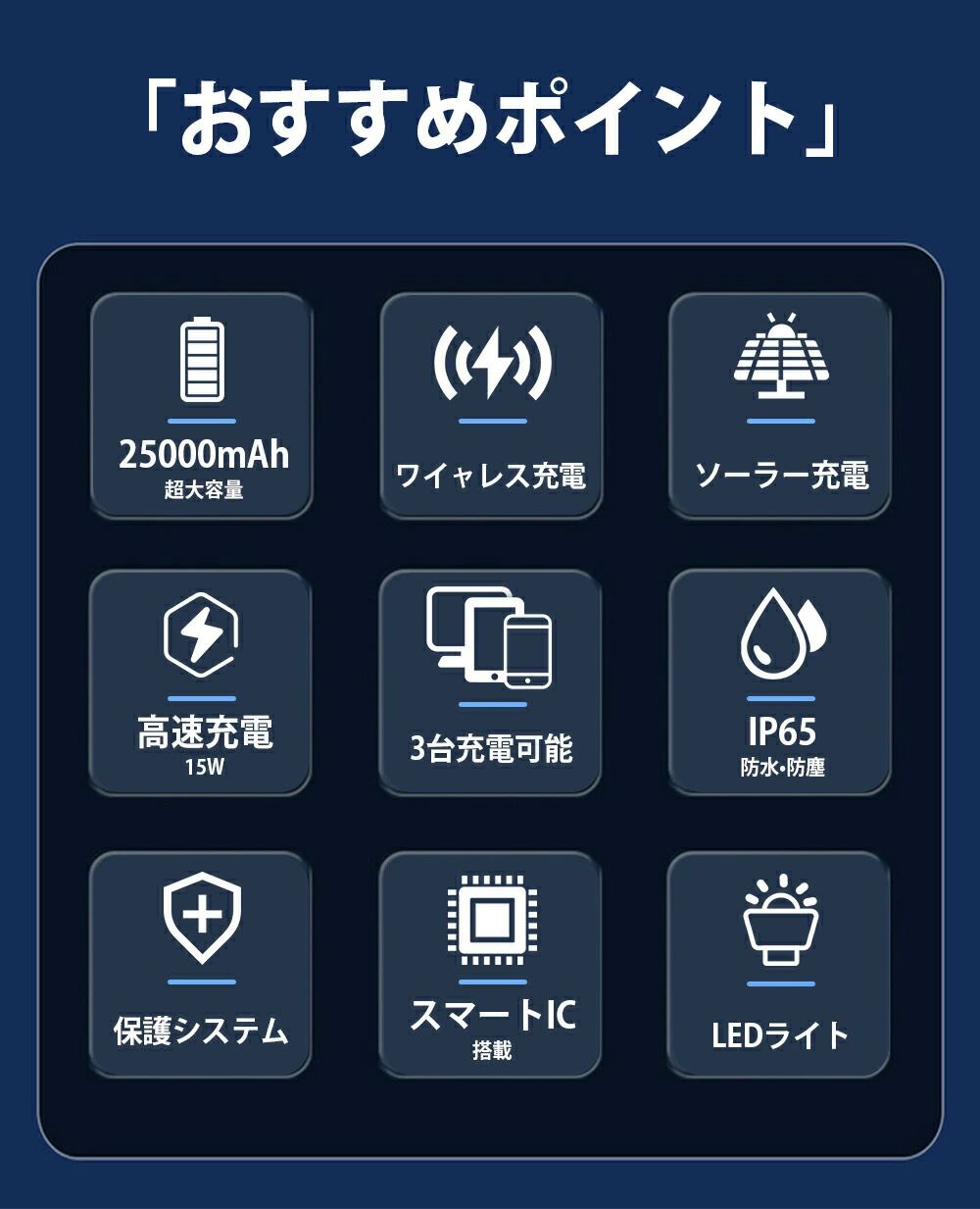 【商品名】 モバイルバッテリー 【カラー】 オレンジ、ブルー、ブラック 【商品仕樣】 ●PSマークの種類:PSE ●電池タイプ:リチウムポリマー電池 ●バッテリー容量:25000mAh ●サイズ:約17.7x8.8x2.5cm ●本体重量:約530g ●蓄電方法:太陽光、USB電源(microUSB、Type-C、USB-A) ※蓄電時間は使用状況、日射条件などによって異なり 【おすすめポイント】 ●【25000mAh超大容量】25000mAhの大容量で、フル充電すれば長い時間で使用で き、電池切れの心配はありません。さらに、最大3台の機器に同時充電できます。 iPhone13を約4.5回、Galaxy S10を4回、iPadAir にも2回ほどフル充電ができます。アウトドアイベント好きな方 におすすめです。 ●【ソーラーチャージャー】本商品は、一般的なモバイルバッテリーと同じようにUSBから給電できます。また、高効率 のソーラーパネルで太陽光も充電できます。アウトドアや災害の時に電源がない場所でも太陽の光さえあれば充電できま す。キャップ/野外BBQ/自転車乗り/停電など様々なシーンで活躍できます。防災グッズ、避難グッズとして1台あれば 助かります。 ●【15W急速充電】高い互換性を持ち、最大15Wという急速充電対応、通常タイプより約3倍の充電速度で、充電時間を大きく短縮できます。 ●【多機能LEDライト】3種の点灯モードがあり、高輝度LEDライトで夜道、野外などの暗い場所で光源が確保できるだけでなく、突然の災害時、SOS信号も出せます。 ●【安全な充電】過充電保護、過放電保護、過電流保、ショート保護、オーバーパワー保護機能など各種保護機能を備え、安全な充電を保証します。 検索用キーワード:ソーラーチャージャー ソーラー モバイルバッテリー 大容量 軽量 iphone se2 au おしゃれ おもしろ 可愛い 小型 コンセント コンパクト タイプc 車 コード microusb 持ち運び ドコモ type-c ケーブル typec 充電 モバイル ドコモ モバイルバッテリー Ipad充電器 air iPhone11 iPhone11Pro iPhone11ProMax iPhoneSE2 SE2 アイフォン8充電器 アイパッド スマートフォン iphone6s アイホン6s充電器 iphone7充電器 外出 plus 6s 5 SE GALAXY S8 XZs X z5 送料無料 荒野行動などゲーム時の充電切れを解決 災害 防災セット 防災グッズ 防災 防災用品 防災対策 備蓄 サブバッテリー タフ 悪環境 過酷な環境 アウトドア サバイバルグッズ 車中泊グッズ 大容量 軽量 コンパクト アンドロイド android apple watch イヤホン かわいい iphone8 急速充電 急速充電器 タイプb 小さい 超軽量 mah 充電器 台風 グッズ 台風対策 防災グッズ 機内持ち込み PSE認証済 緊急用必携品 敬老の日 おすすめ お歳暮 2022 セール 防災グッズ 25000mah より増量 成人の日 成人式 バレンタイン バレンタインデー ホワイトデー 卒業式 入学式 母の日 父の日 敬老の日 クリスマス クリスマスプレゼント Xmas 誕生日 還暦祝い お祝い 合格 ギフト プレゼント 父の日 プレゼント 実用的 父の日ギフト