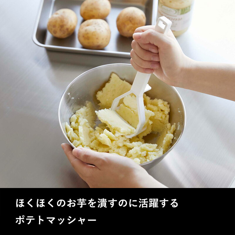 先端が「浮く」キッチンツール。シリコーンハンドルシリーズ。 ハンドルは手にフィットするシリコーン製。マッシャー部分はナイロン製でガラスボウル等も傷つけにくく使いやすい。 茹でたお芋をスムーズに潰せるポテトマッシャーです。 // 食洗機対応 // ●北海道・沖縄・離島は追加送料がかかります。注文確認後、送料修正しご案内いたします。towerシリコーンハンドル ポテトマッシャー タワー 使ったあと、そのまま置けるキッチンツール。シリコーンハンドルシリーズ。 茹でたほくほくのジャガイモやカボチャなどの食材を、効率よく潰してくれるポテトマッシャーです。 マッシャー部分はボウルにフィットするカーブ形状で潰しやすく、潰した食材が上部に溜まらない構造なので、均等かつスムーズに潰すことができます。 調理の途中でもそのまま置ける自立デザインがさらに使いやすさアップ。別で置く場所を用意する手間を省いて、清潔なままお使いいただけます。 食器洗い乾燥機に対応しているので、家事の負担軽減にも。 ポテトサラダやコロッケ、離乳食づくりにも活躍してくれるポテトマッシャー。より効率的に食材をつぶすことができるので、ご家庭に一本は備えておきたいアイテムです。 このポテトマッシャーはマッシャー部分がカーブしており、ボウルに対して食材をしっかり押しつぶすことができます。 さらに手にフィットするシリコーンハンドルとY字型のマッシャーは、力を込めやすくよりスムーズに。調理の効率アップにおすすめです。 そのまま置いても先端が浮いてくれる便利仕様。 調理の途中でも、そのまま作業スペースに置くことができます。別途、ツールスタンドや置き皿を用意する手間もありません。 使ったあとでも直置きにならず、清潔なままお使いただけるキッチンツールです。 → 商品を見る → 商品を見る → 商品を見る → 商品を見る → 商品を見る → 商品を見る → 商品を見る → 商品を見る → 商品を見る → 商品を見る → 商品を見る → 商品を見る ⇒ 商品カテゴリー>キッチンツール ⇒ 収納悩みを解決!山崎実業のツール収納グッズ ⇒ 特集「キッチンからはじめる快適な暮らし」 [ NEW ] 大人気のtowerなど山崎実業の最新アイテムはこちら ●商品の詳細● 品 名 tower シリコーンハンドル ポテトマッシャー タワー サイズ 約 幅6 × 奥行き5 × 高さ20cm 材 質 シリコーン・ナイロン 重 量 約 50g 耐 熱 220℃ カラー ホワイト/ブラック 入 数 1個 備 考 食器洗い乾燥機対応 ■注意点 ※耐熱温度はお守りください。耐熱温度以下であっても長時間の連続使用はお止めください。 ※加熱したフライパンや鍋などの中に入れたまま放置しないでください。熱くなり火傷の原因になります。 ※火のそばに置かないでください。耐熱温度以上の熱が加わりますと、溶けたたり、変形、変色、着色の原因となります。 ※使用中にシリコーン部分の温度が高くなると、先端が柔らかくなり食材を混ぜたり、すくいにくくなる場合がありますのでその際は、水などで冷やしてご使用ください。 ※繰り返しの使用や色の濃い材料に使用された場合、変色・着色することがりますが、品質に問題なくご使用いただけます。 ※直火・グリル・オーブンレンジ・オーブントースター・業務用電子レンジ・業務用食器洗い乾燥機でのご使用はおやめください。 ※商品の色は、画像と実物とでは多少異なる場合がございます。色・イメージが違う等の理由による返品は一切お受けできません。予めご了承下さい。